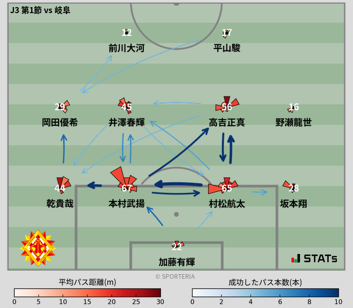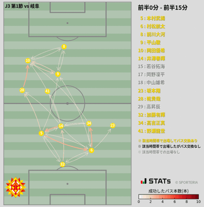 パス数が昨シーズン最終節岐阜戦と比べると50本ほど減っていて、状況を見て最短距離でゴールを目指す意識が高まっていることがわかる。