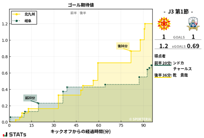 相手を自由にさせず上手く守れていたが、相手GKが蹴ったボールをヘッドで繋がれ、ポッカリと空いた中央で待っていた庄司選手に拾われる。そして、北九州CBの間にバックスピンをかけたキレイなスルーパスが入ると、ンドカ選手が加藤との1vs1を制してゴール。北九州は20分に先制を許してしまう。