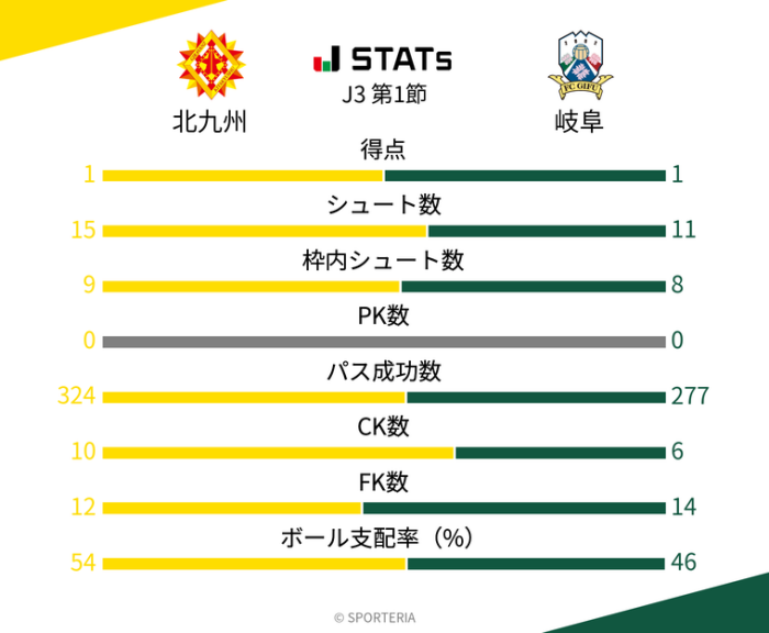 北九州は尻上がりに調子を上げ、36分に乾の同点弾が生まれた。そこからイケイケムードとなったが得点をあげることができず、決定力に少し課題を残した。