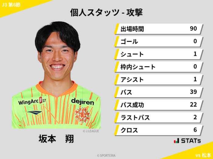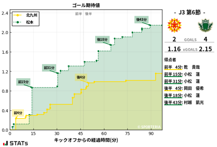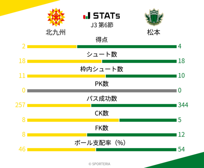 数値上はほぼ互角に戦えているが、オーバーヘッドキックなどで決めるべきところをしっかり決めた松本と、2度ポストやバーを叩いた北九州との差が出た試合だった。