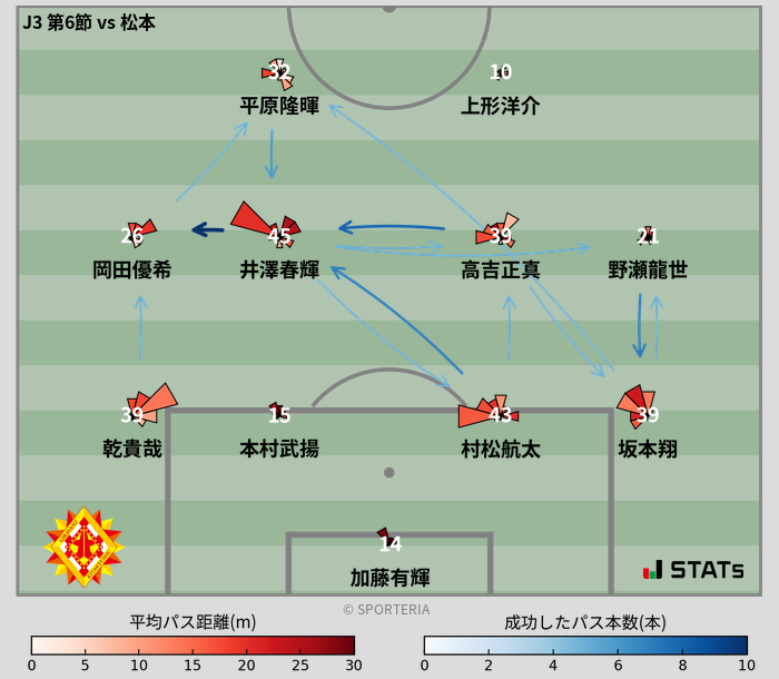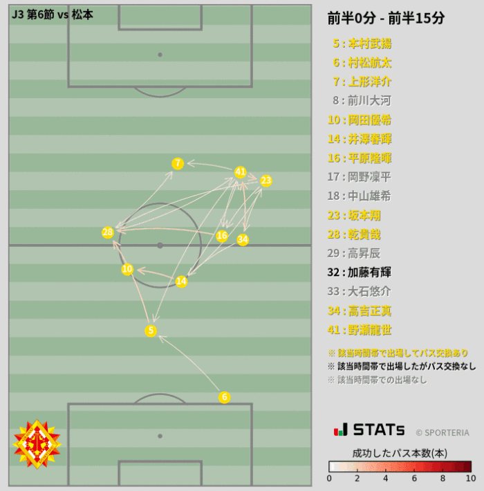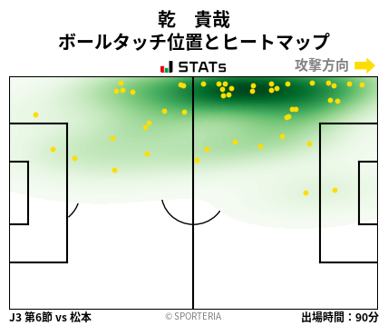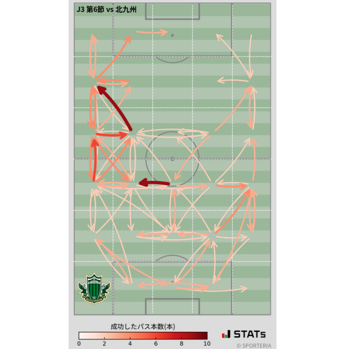 相手DFとしては本来いないはずの選手が出現するのでマークに付けず、乾の得点や坂本の惜しいミドルシュートに繋がった。このレーンまたぎは今後の北九州の攻撃パターンの一つとなりそうだ。