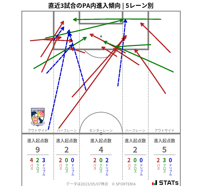 クロスを入れられている数が多く、サイドの守備はそれほど厳しくないことが予想されるので、サイドバックは落ち着いて良いクロスを入れてほしい。