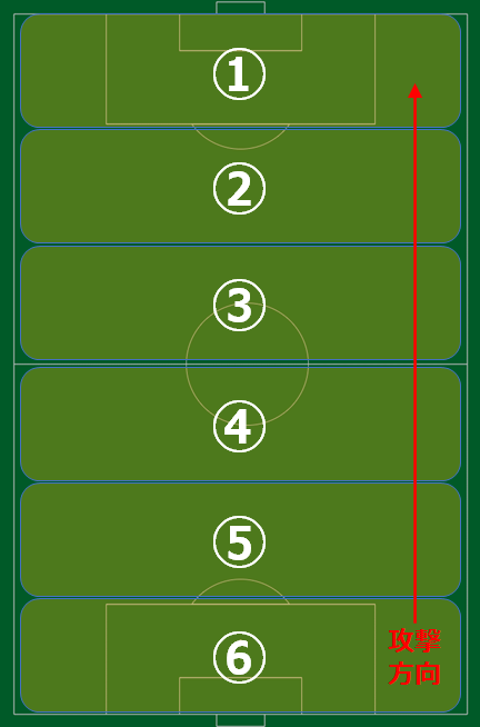 下から上に攻める形で、相手のゴールに一番近いエリアを①とします。