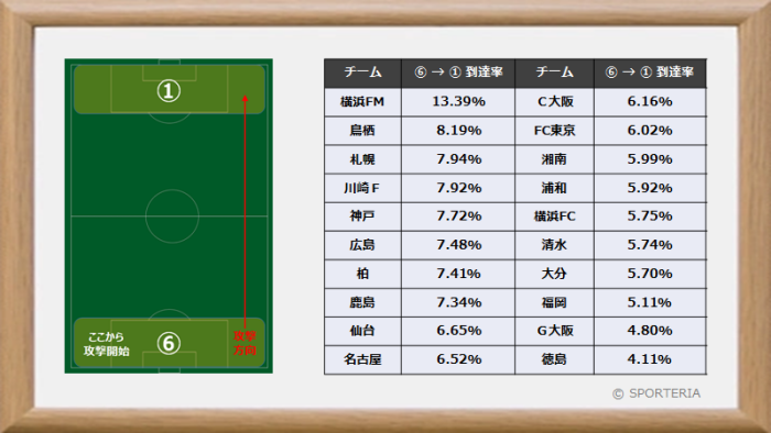 では、⑥→①へボールを運んだ割合をチーム別に見てみましょう。