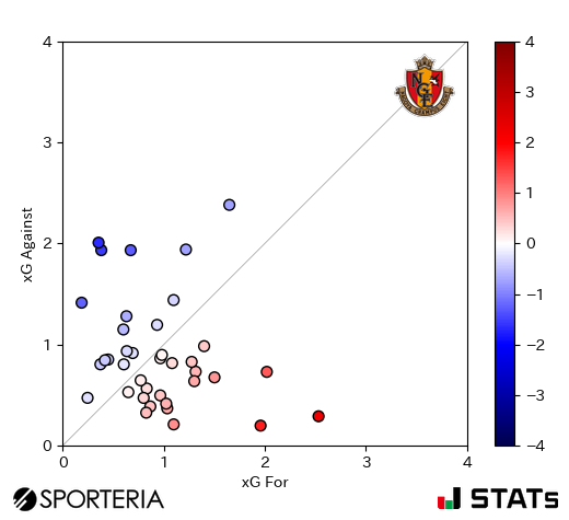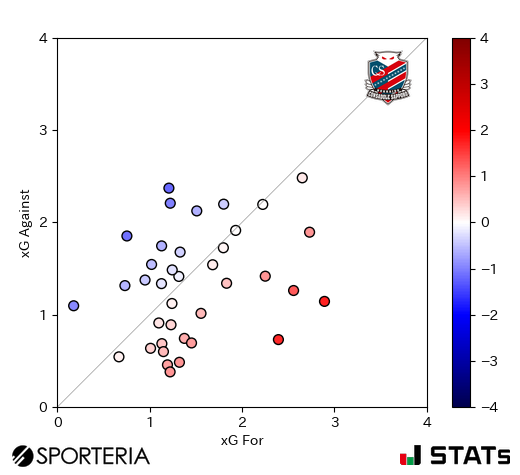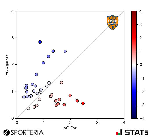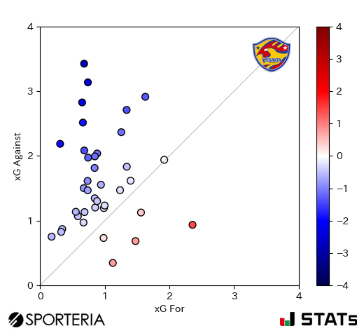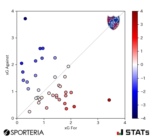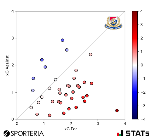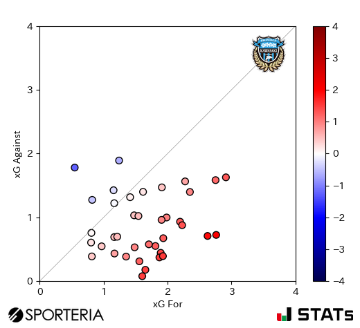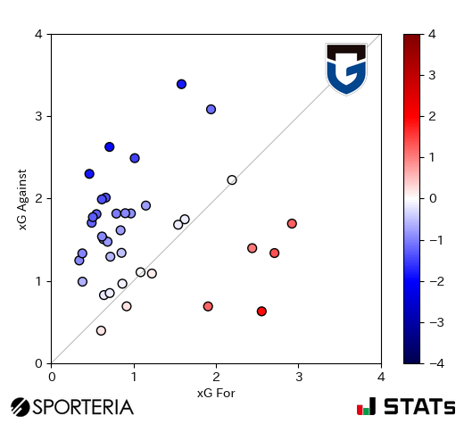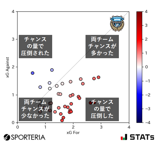 右に行くほどゴール期待値が高く(チャンスが多く)、上に行くほど被ゴール期待値が高い(相手のチャンスが多い)試合になります。