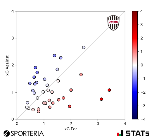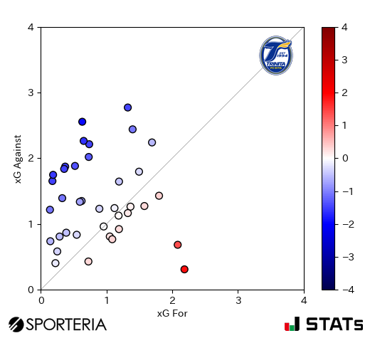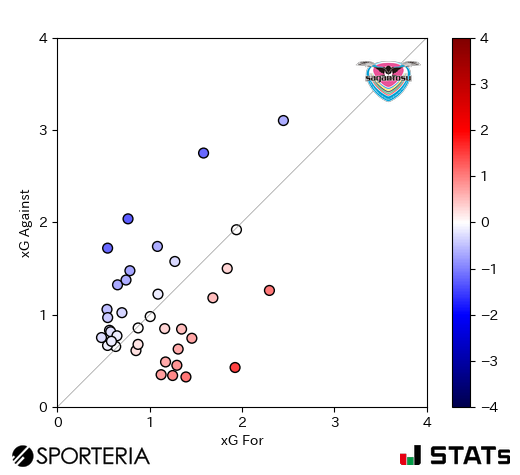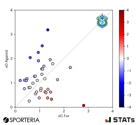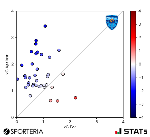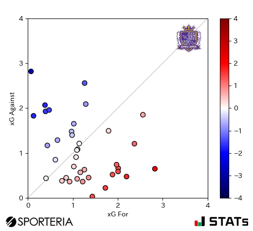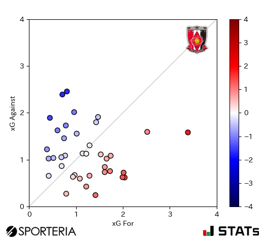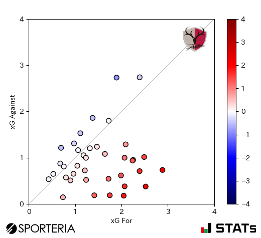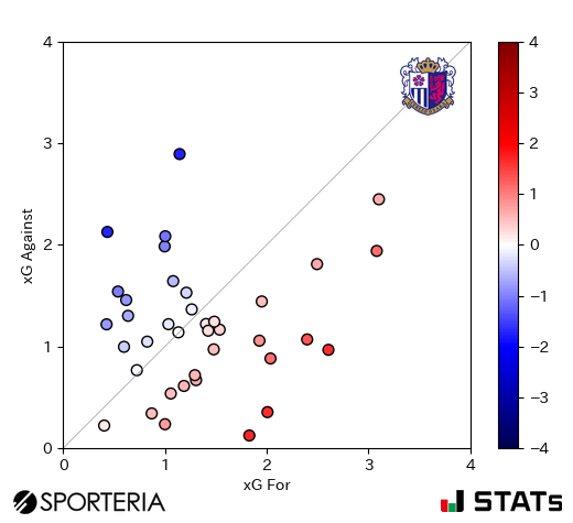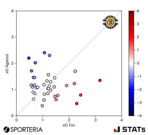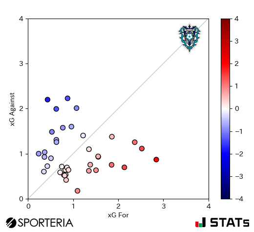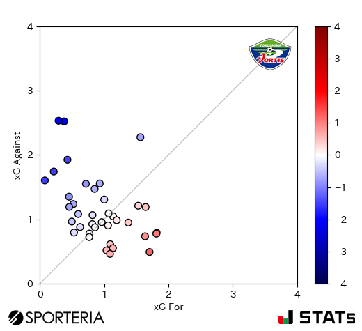 斜めのラインの上に来ている丸(ゴール期待値で劣勢の試合)が少ないのが、さすがですね。
