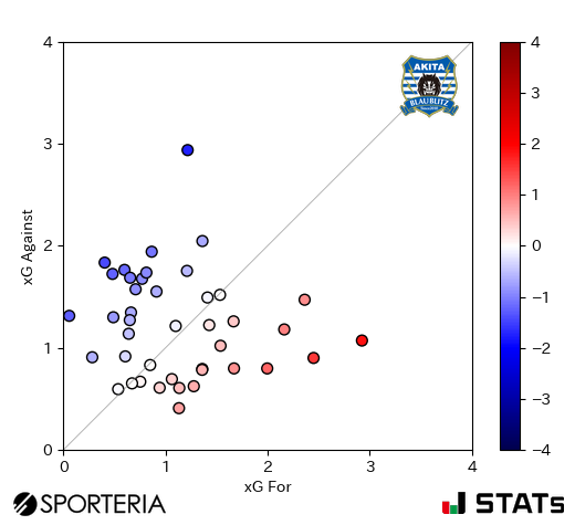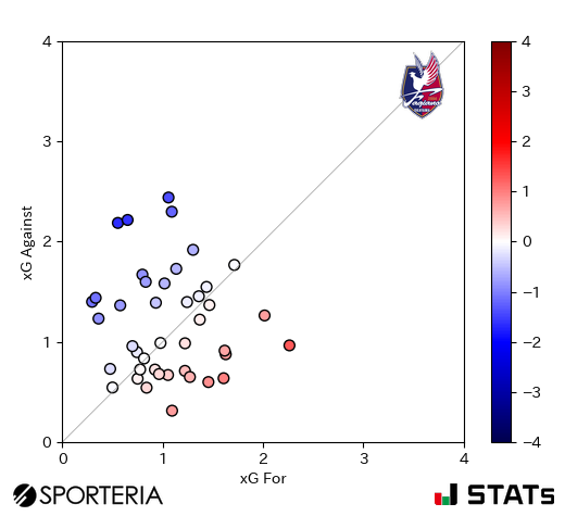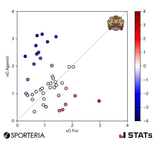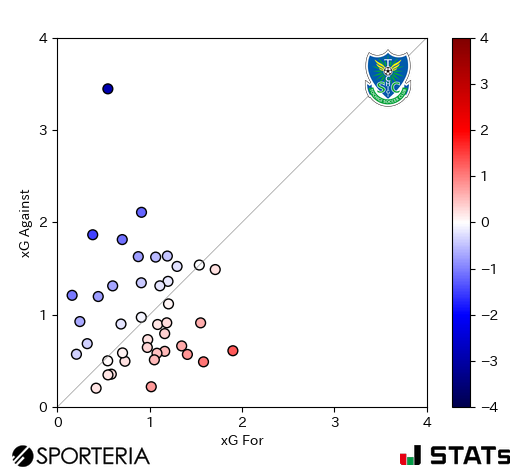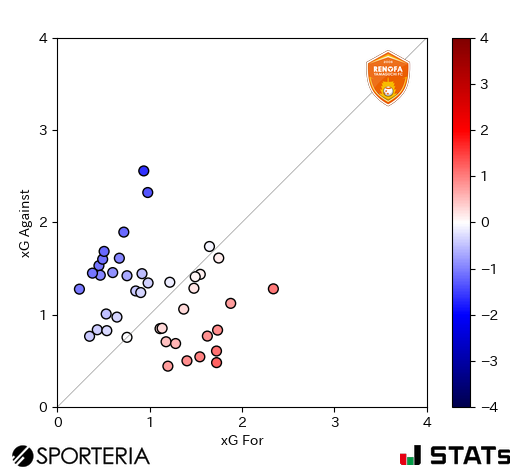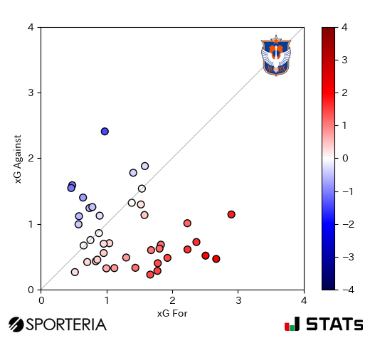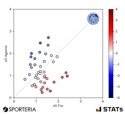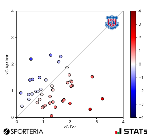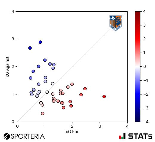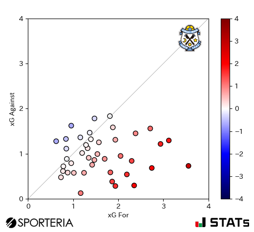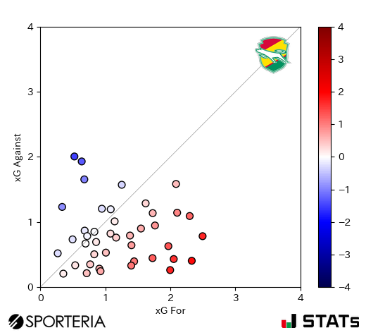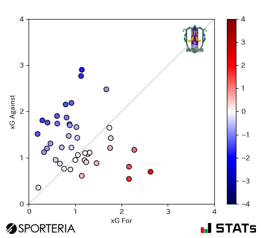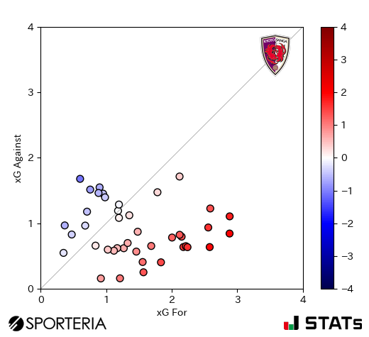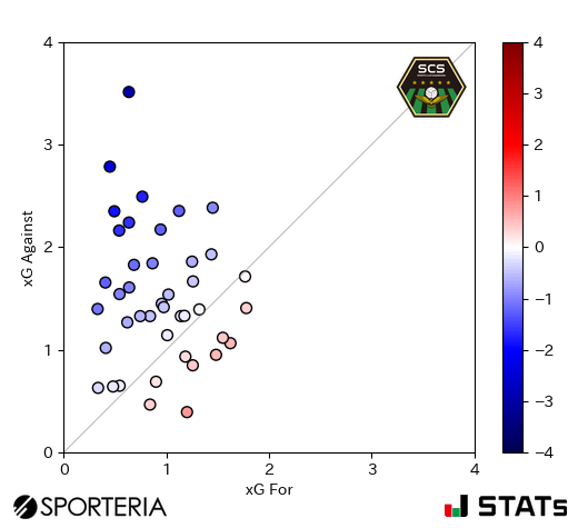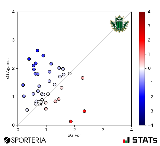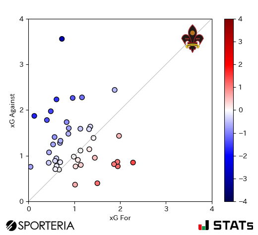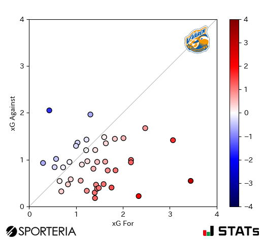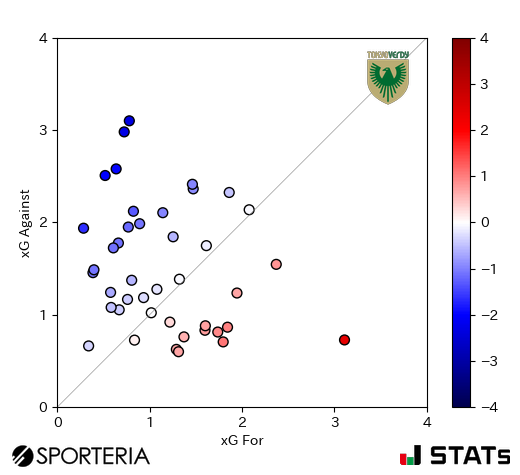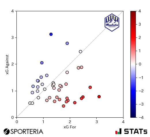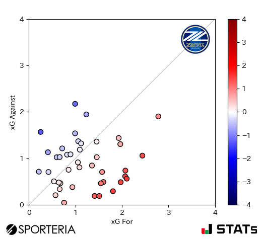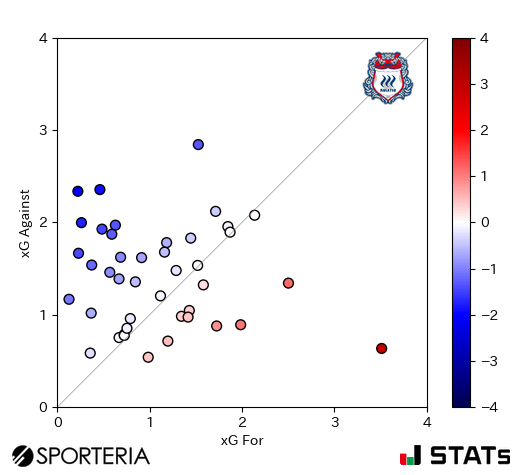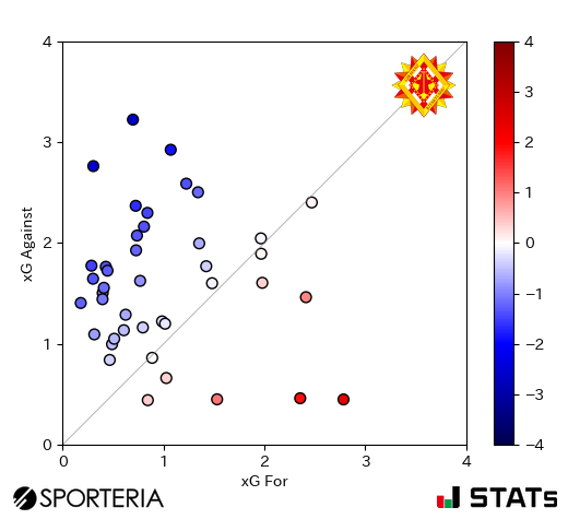 右に行くほどゴール期待値が高く(チャンスが多く)、上に行くほど被ゴール期待値が高い(相手のチャンスが多い)試合になります。