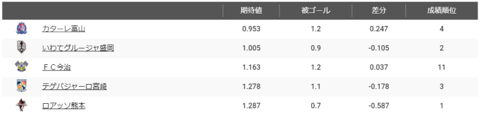 しかし、実際の得点は期待値よりも1試合あたり0.235点低く、実際の失点は期待値よりも0.261点高くなっていました。
