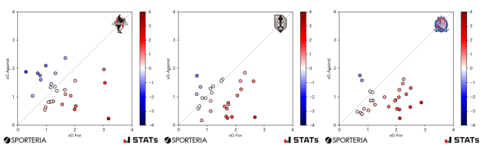 次に、試合単位でのゴール期待値/被ゴール期待値のマッピングを見てみましょう。