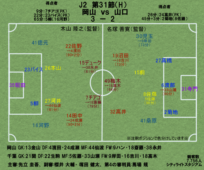岡山が、山口の良さをシステム変更とメンバー変更により打ち消したことで、山口が浮ついたところを岡山の武器であるセットプレーでの勝ち越しゴールを決める事に成功した。