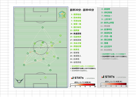 この時魚里選手はパスネットワークには参加しておらず左サイドからの失点ということもありディフェンスに多くの時間を割いていたのではないかと考えます。