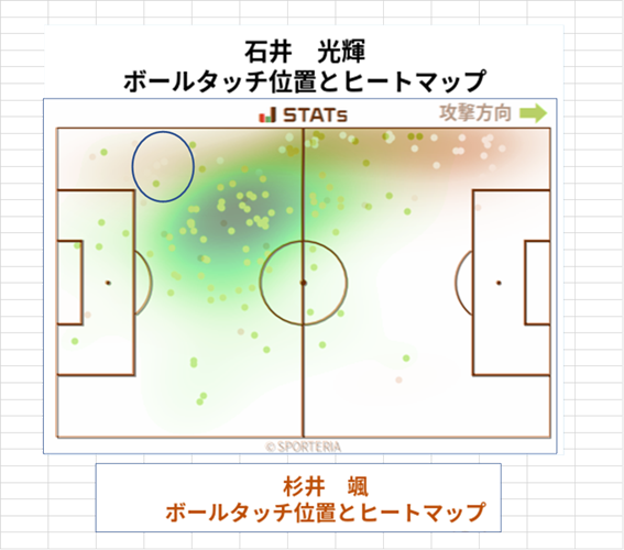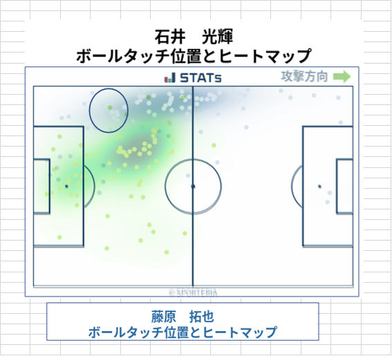 そして次の図は藤枝戦での石井選手と藤原選手のヒートマップを重ねたものです。