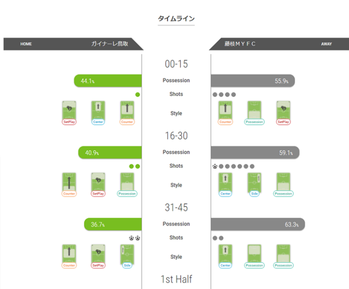 ボール支配率は開始15分はほぼ互角そこから藤枝が押してきます。