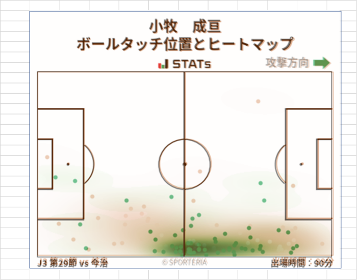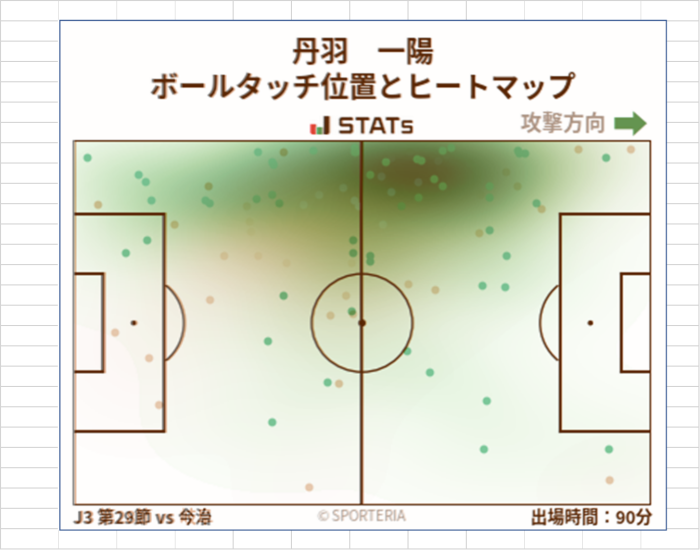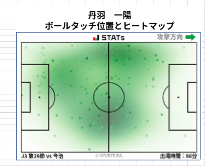緑は前節今治戦でのボールタッチとヒートマップです。