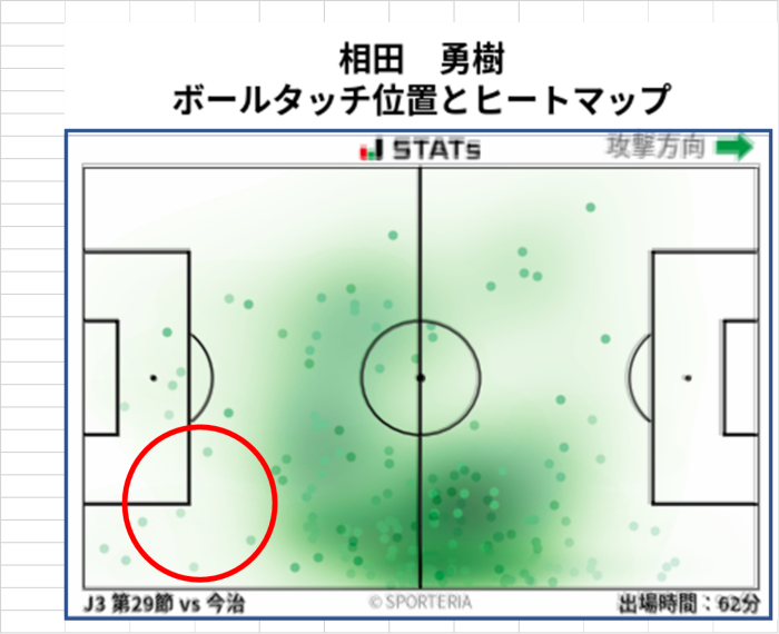 今治戦ではヒートマップが小さくなり右サイドの一部のみになっているのがわかります。