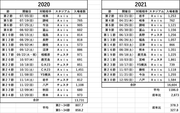 下図は2020,2021年の鳥取の入場者数です。シーズン総括で2020年の平均入場者数を807人と言われていましたが、第2節は無観客開催であり実際には第5節~第34節までの平均858人だと思います。