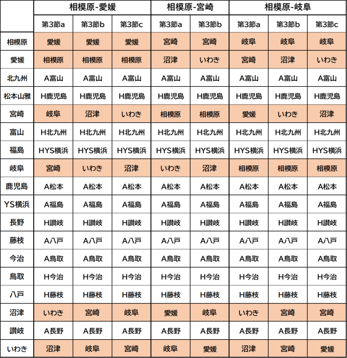 相模原の対戦相手が3チームでこのケースから分けると以下の8パターンに分けられます。