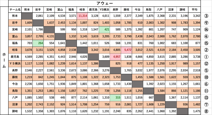 注目点は平均入場者数で1位は鹿児島、2位は岐阜という結果になりました。最多入場者数は熊本-岐阜でしたが2位は岐阜-藤枝、3位は鹿児島-長野と近県の対戦ではないところも興味深いです。