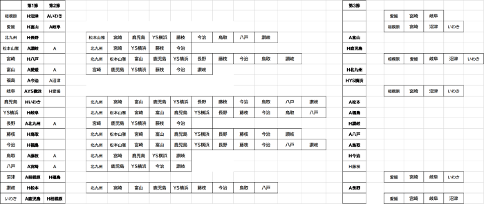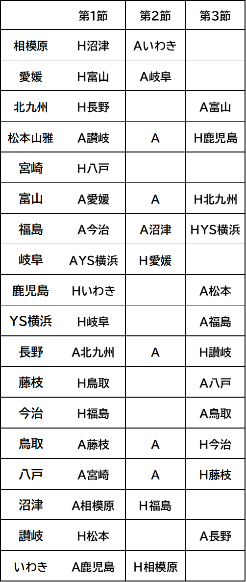 北九州、宮崎、鹿児島、YS横浜、藤枝、今治、讃岐のうちどこかがアウェーで戦います。