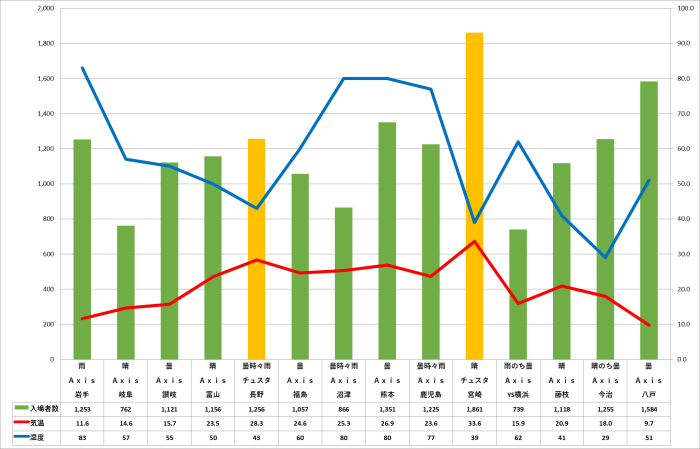 そして各試合のホーム入場者数、気温、湿度を現したのが下図です。