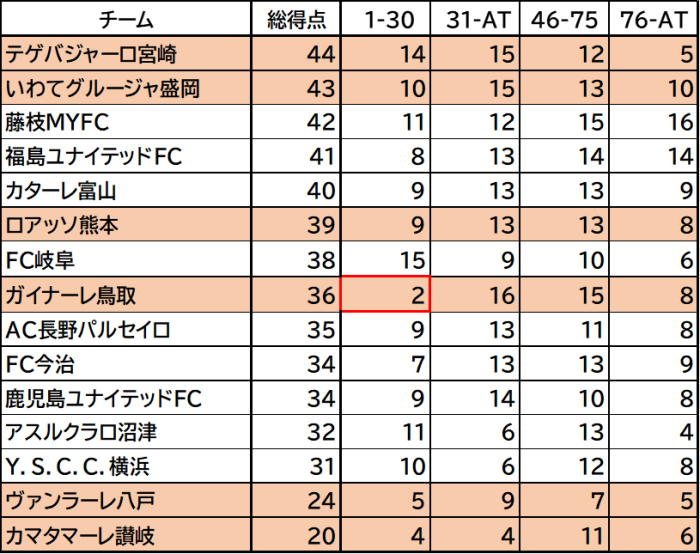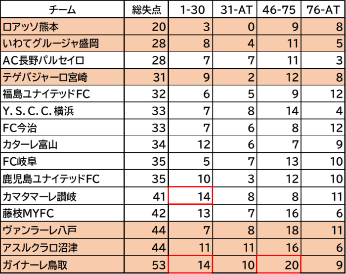 鳥取は前半30分までで讃岐と同じく14失点、後半75分まででは単独でワーストです。