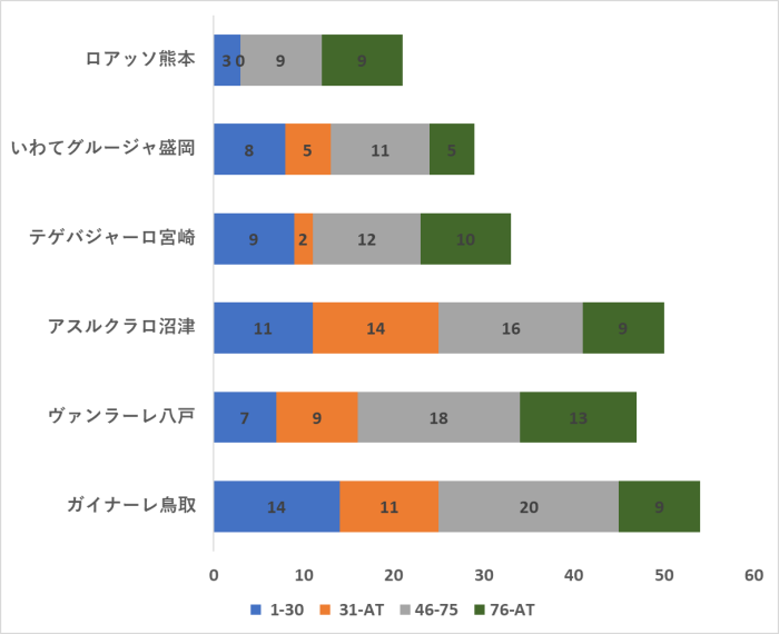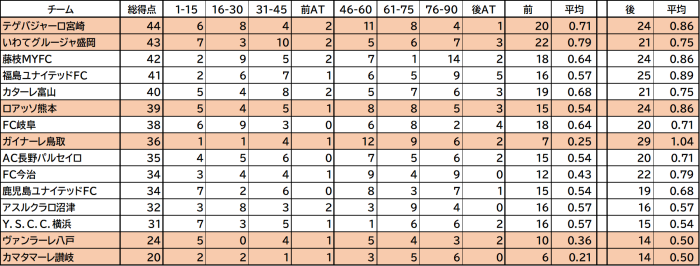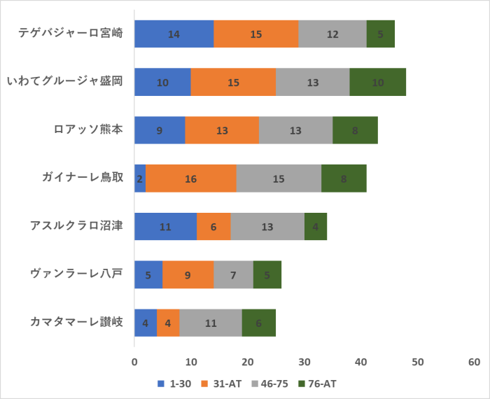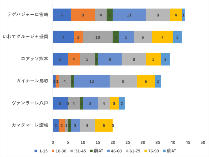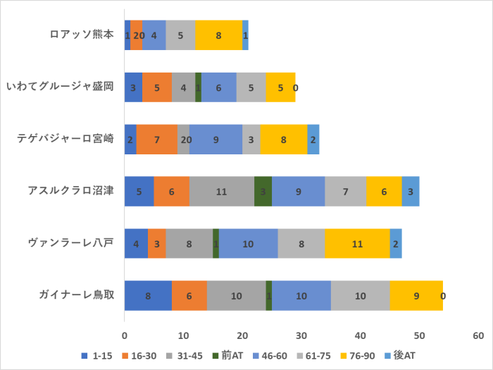 優勝した熊本と鳥取は3点差であり大きな差はないように思いますが、鳥取は46-60分で12得点しており宮崎を超える得点力です。