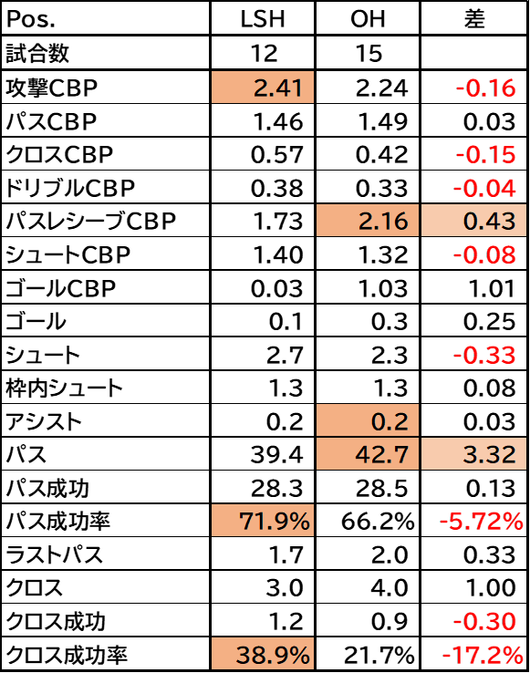 下図はそのシーズンのフットボールラボから各スタッツとSPOTERIAからの各スタッツです。