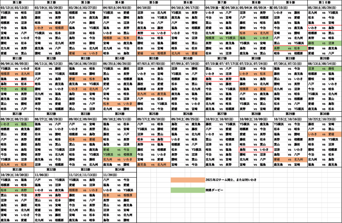 2021J2同士または対いわきFC戦を赤、今シーズン話題となっている同県ダービーを緑に塗ってみました。第2~6節までに相模原、愛媛はいわきFCやJ2同士の対戦がありいきなり試練です。