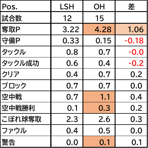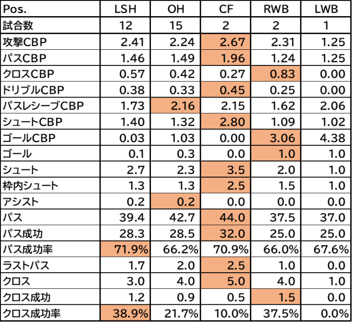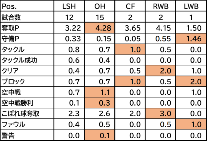守備ではOHで奪取Pの数値が最も高く、前線からの守備に期待されます。
