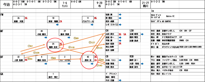 選手はスタメンで各ボジションで一人を残し退団ですが、パス交換で控えの山田、島村、安藤選手