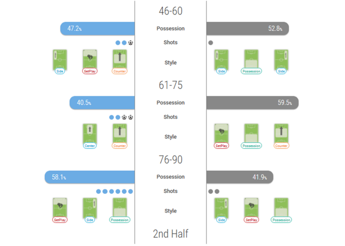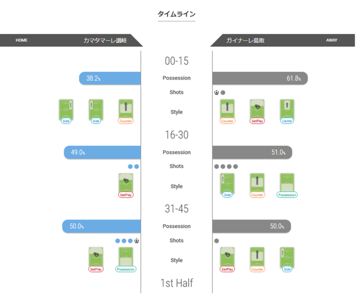 先制点を記録した開始15分間は支配率が6:4とリードしており讃岐のシュートも0本と抑えていました。