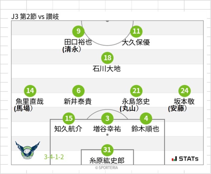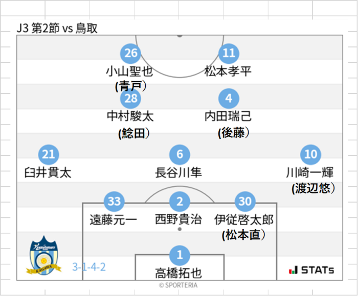 讃岐のスタメンは開幕節の後半23分からのフォーメーションと同じく右WBに川崎選手が入り内田選手は2列目に、右CBには大卒新加入の伊従選手が初出場、初スタメンとなりました。