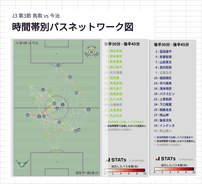 後半30-45分の鳥取と今治のパスネットワークを重ねたとき鳥取の左サイドを魚里、妹尾選手が攻め