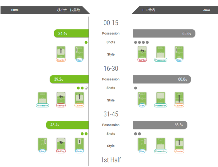 鳥取としては守備面で今治のDH楠美選手のパスをDHの2人が、中川選手のスピード、個人技をCB2人がどう抑えるかが注目されました。