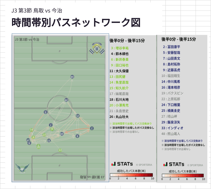 下図は後半0-15分の鳥取と今治のパスネットワークを重ねたものですが左側のCB鈴木、SB丸山、SH石川選手、そしてFW大久保選手がパスに関われず、今治の島村、下口、インディオ、山田、中川選手などが高い位置でパスをしています。