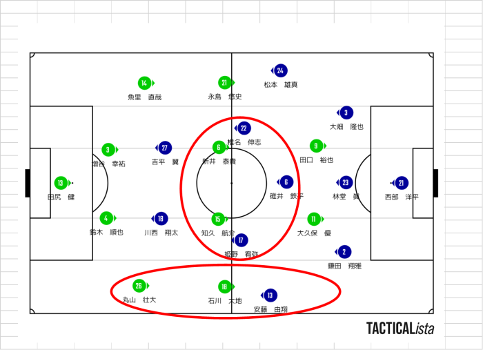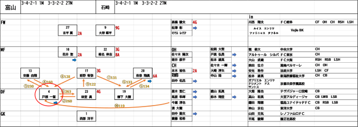 攻撃では、2列目の選手が富山のアンカー脇でボールを受けられれば、2トップがゴールに向かってプレーできそうなので、そういうシーンに期待しています💡