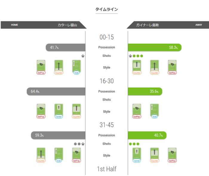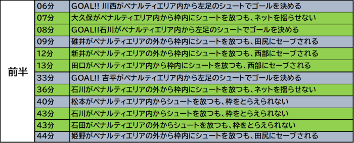 左図はフットボールラボからのタイムライン、右図はJリーグの試合経過からチャンスシーンを抜粋してみました。