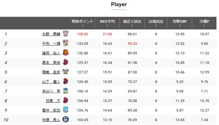 こちらもフットボールラボからの奪取ポイントのランキングですが諸岡選手が3位につけています。