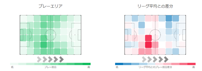 これに前節の諸岡選手のヒートマップを比べると濃い部分が重なります。