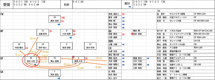 またフォーメーションでも4-4-2のミラーゲームで行うより、トップ下を置いた4-2-3-1にし愛媛のSB裏のスペースを左SHの田口選手や右SHの小田垣選手などが生かせトップ下の永島選手や知久選手からもパスが出るのではないかと考えます。