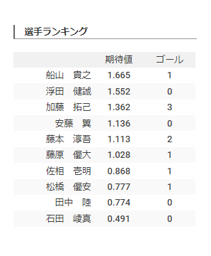 また下図はフットボールラボからのゴール期待値とゴールですが、期待値が高くても今シーズン無得点の選手がおりそちらの選手も要注意です。