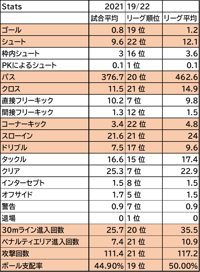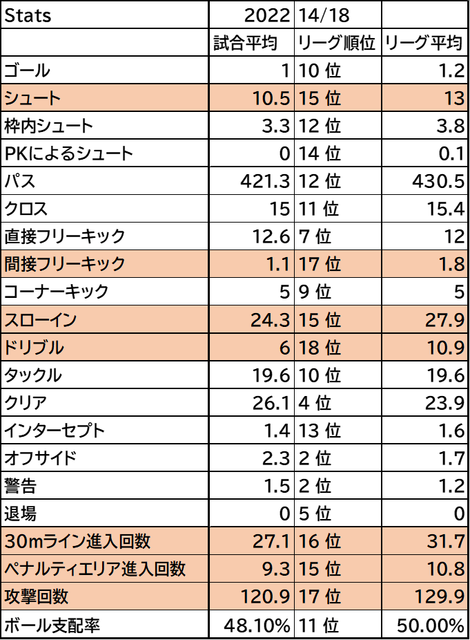 今シーズンもシュート、攻撃回数など同じ項目が低くなっていました。