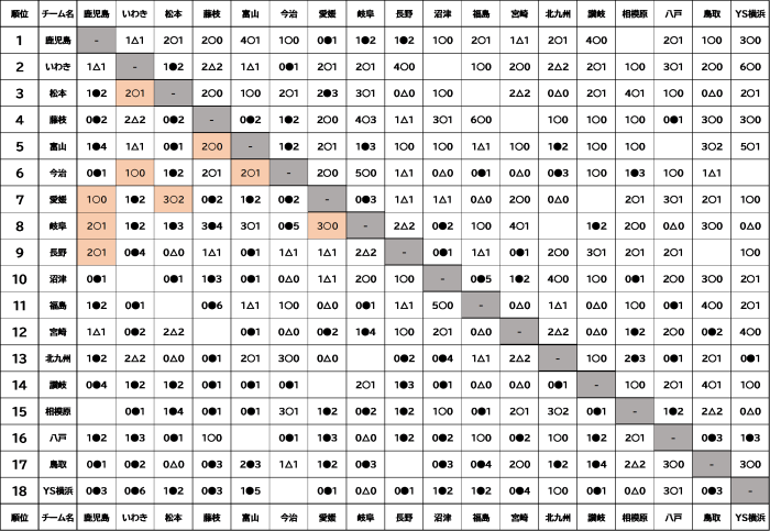 鹿児島が現在1位ですが7~9位の愛媛、岐阜、長野に負けており後半戦での対戦が楽しみです。