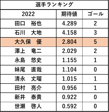 しかし今シーズンは宮本選手が期待値3.1に対し4ゴールを挙げているのみです。