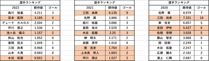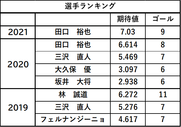 2020、2021シーズンは三田選手が期待値7.3に対し10ゴール、期待値6.1に対し9ゴールと上回るゴールを上げています。