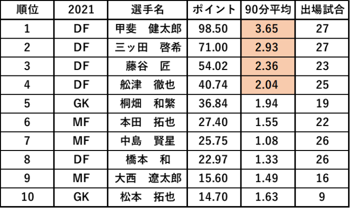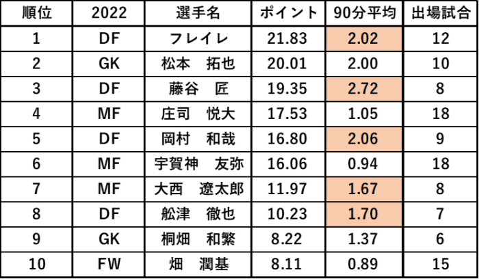 2021年はDF陣が上位を占め1試合平均3.65~2.04ですが、2022年はGKやMFも上位で1試合平均も2.02~1.70と低くなっています。またフレイレ選手は攻撃のポイントで5位の13.86、1試合平均1.28と攻撃の意識が強くなっています。これにより守備が前がかりとなっている可能性があります。