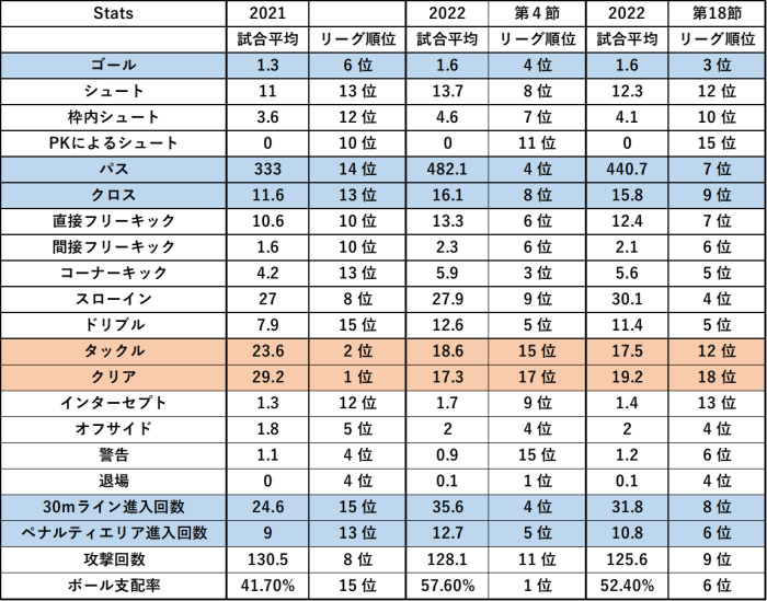 ゴール、パス、クロス、進入回数などの攻撃的な数値はリーグ順位が向上しましたがクリア。タックルなどの守備的な数値は低下しました。