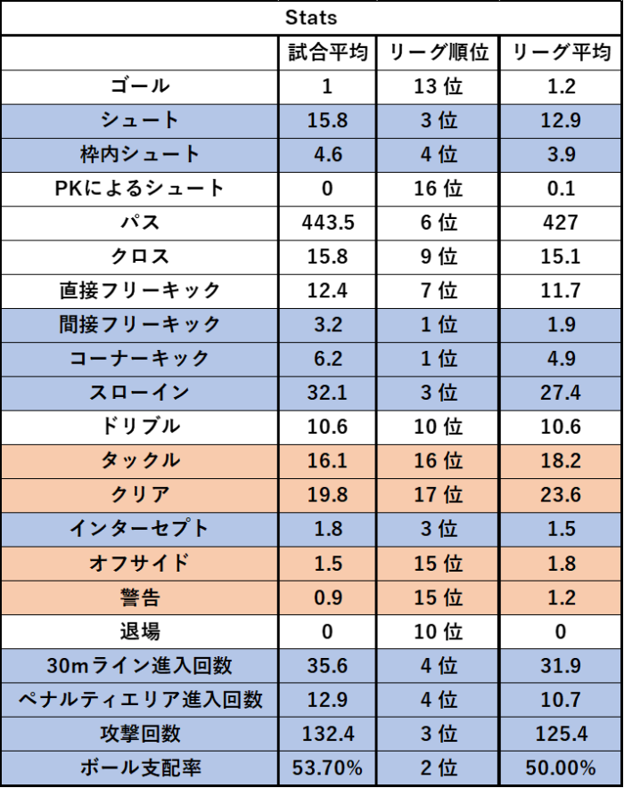 攻撃の「シュート本数」や「進入回数」、「攻撃回数」、「ボール支配率」などは上位ですが、