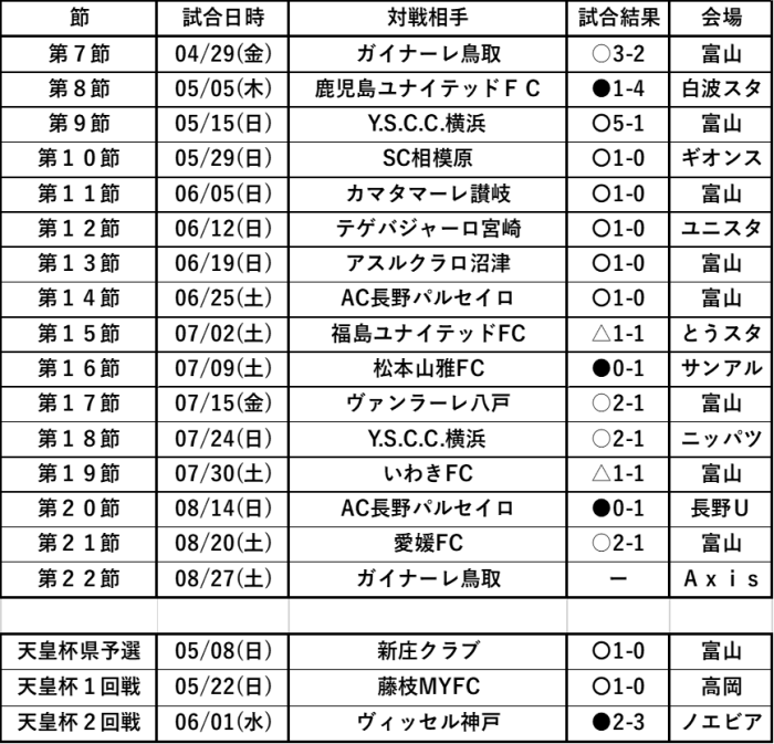 リーグ戦は前回の鳥取戦は強い雨風の中の試合で勝利。その後は鹿児島戦で大敗、YS戦で大勝した後は1点差のゲームが続きます。特に第10節の相模原戦から第14節の長野戦まで5試合はすべて「1-0」で勝利と初のチーム6連勝を記録しました。