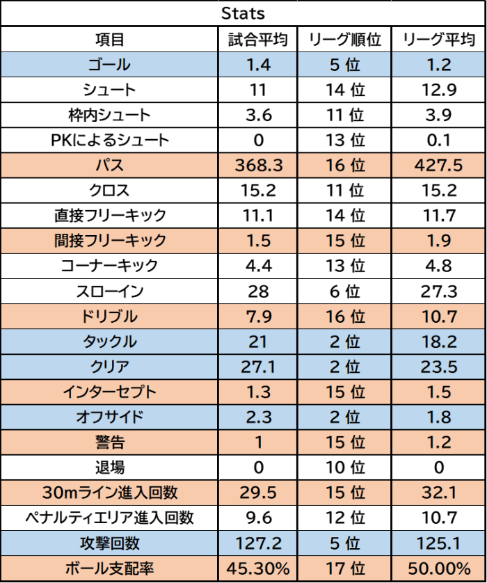 そしてフットボールラボからチームスタッツですが、前回の宮崎とは対照的に「タックル」「クリア」の数値が上位です。逆に「ボール支配率」では17位と下位になっています。